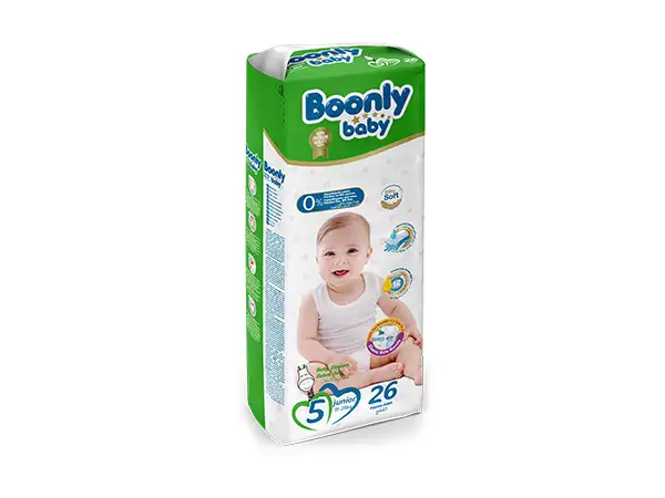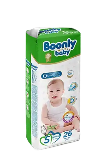 26 Adet 5 Numara Junior Boonly Baby 5 Numara Junior Bebek Bezi Boonly Baby 5 Numara Junior Bebek Bezi, 26 adetlik paketiyle hassas ciltlere özel yumuşak dokusu ve üstün sızdırmazlık özelliğiyle bebeğinizin konforunu korur.
