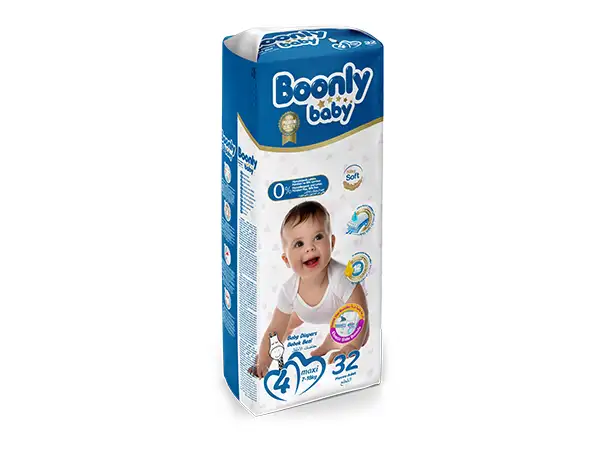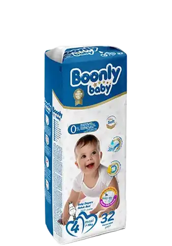 Boonly Baby 4 Numara Maxi Bebek Bezi, 32 adetlik paketiyle hassas ciltlere özel yumuşak dokusu ve üstün sızdırmazlık özelliğiyle bebeğinizin konforunu korur.